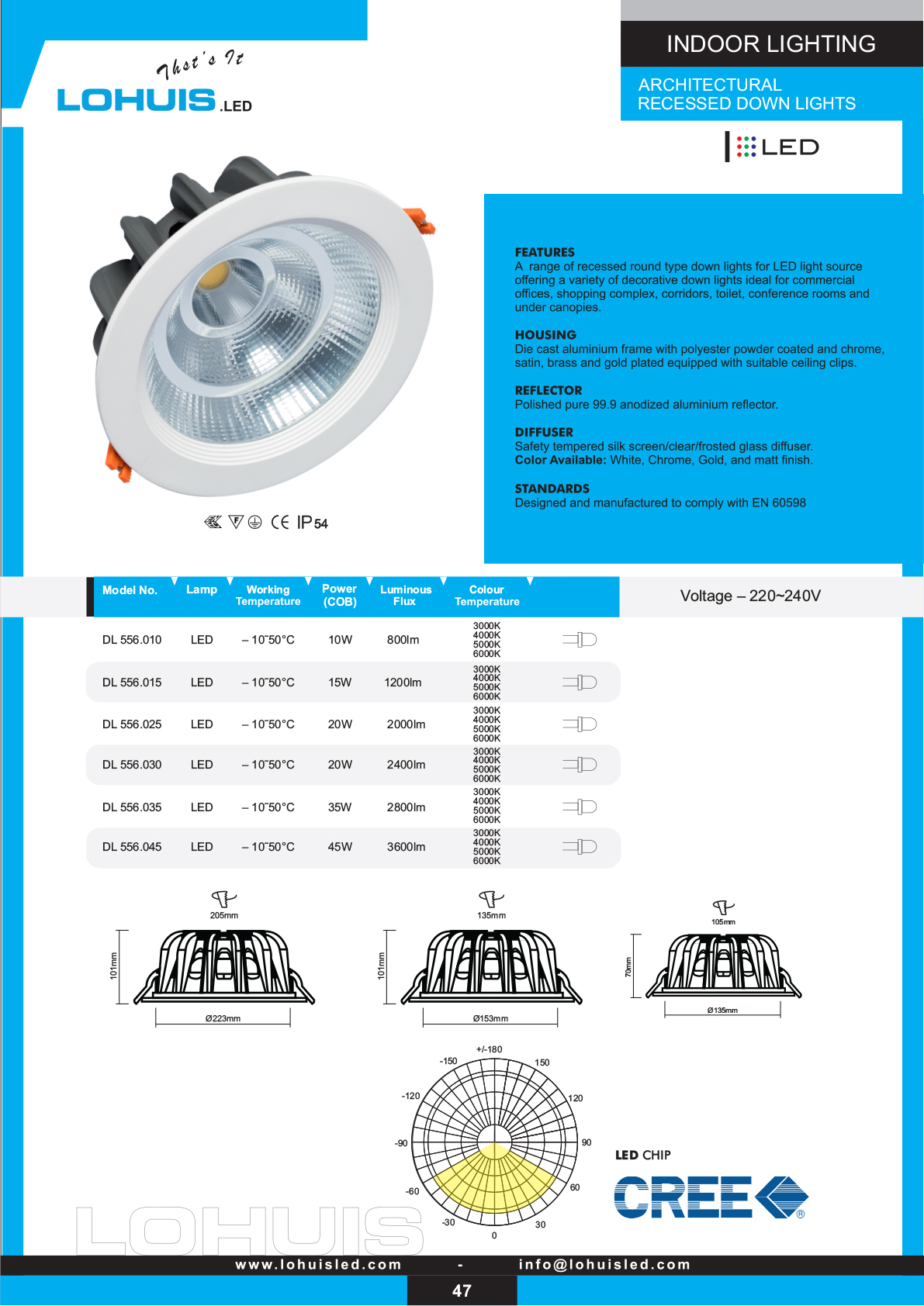 A range of recessed round type down lights for LED light source offering a variety of decorative options; Reflector: Polished pure 99.9 anodized aluminium; Diffuser: Safety tempered silk screen/clear/frosted glass diffuser