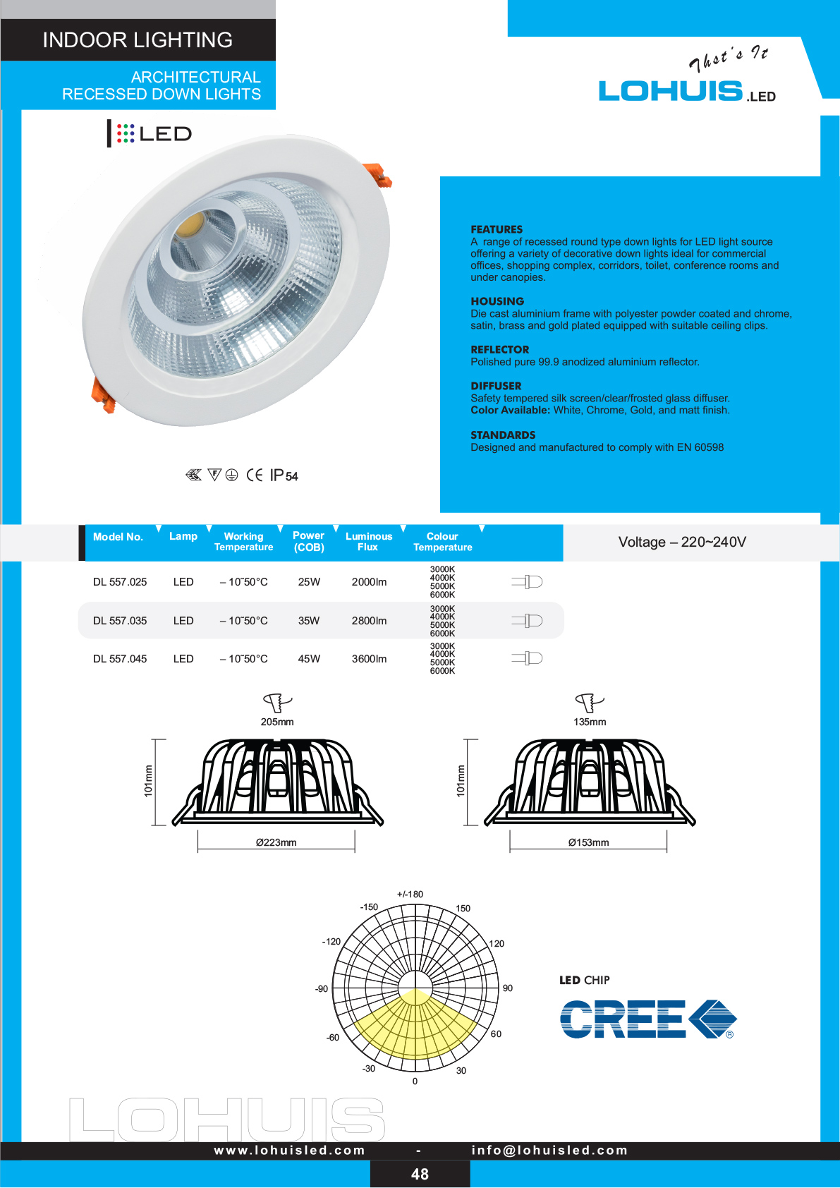A range of recessed round type down lights for LED light source offering a variety of decorative options; Reflector: Polished pure 99.9 anodized aluminium; Diffuser: Safety tempered silk screen/clear/frosted glass diffuser