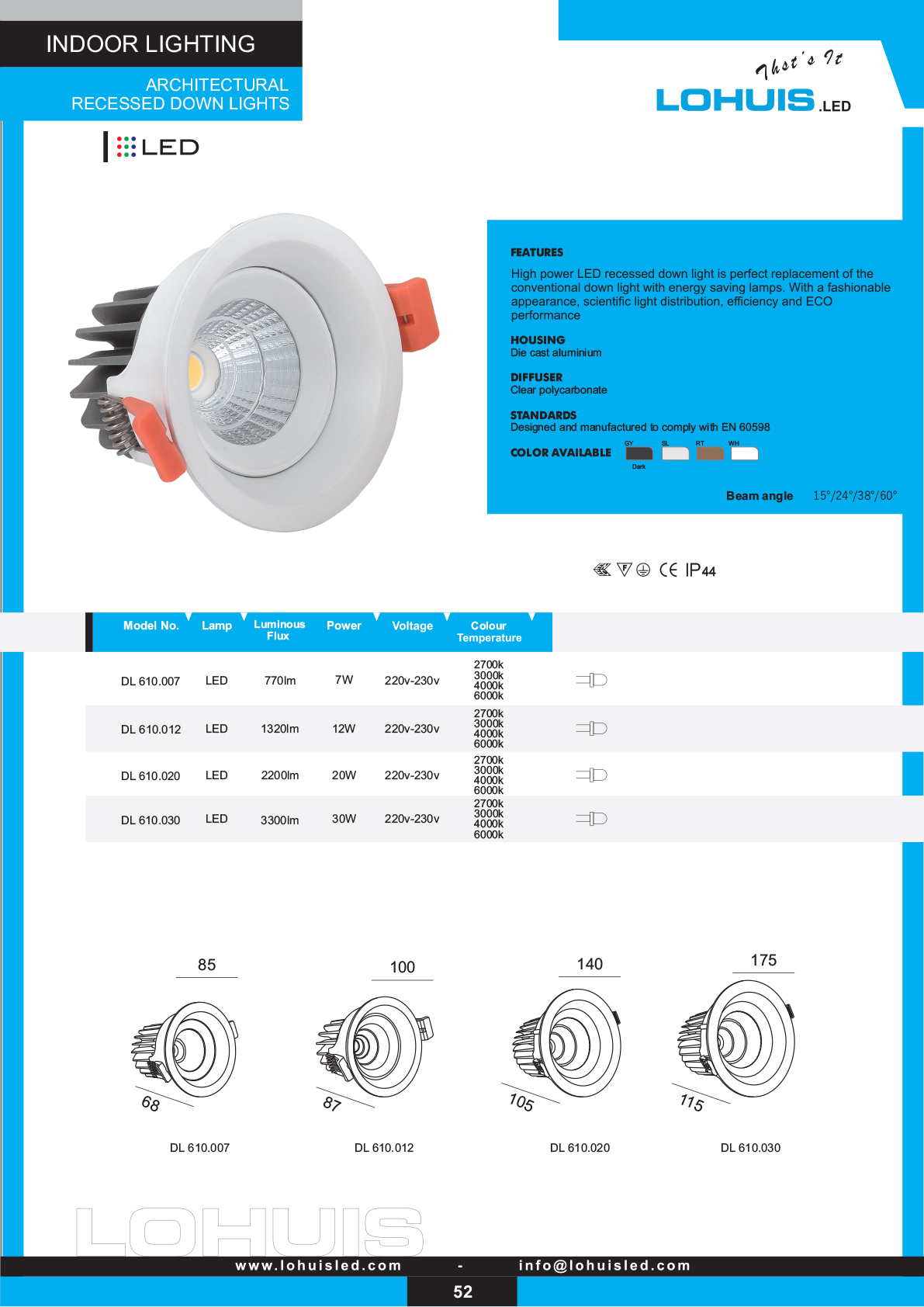 High power LED recessed down light; replacement for conventional downlights; fashionable appearance; scientific light distribution; efficiency & ECO performance; Beam angle options 15°/24°/38°/60°