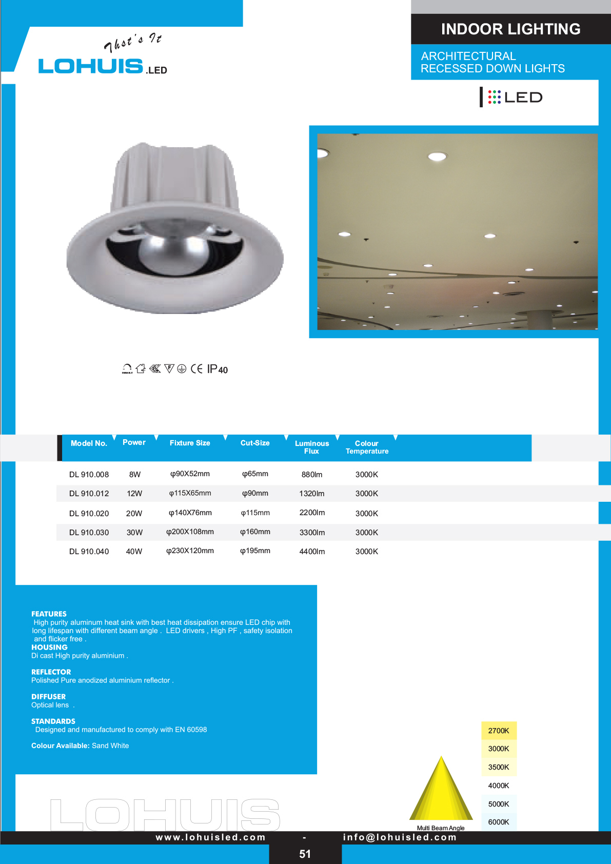 High-purity aluminium heat sink for best dissipation; long lifespan; different beam angles; LED drivers; high PF; safety isolation; flicker-free