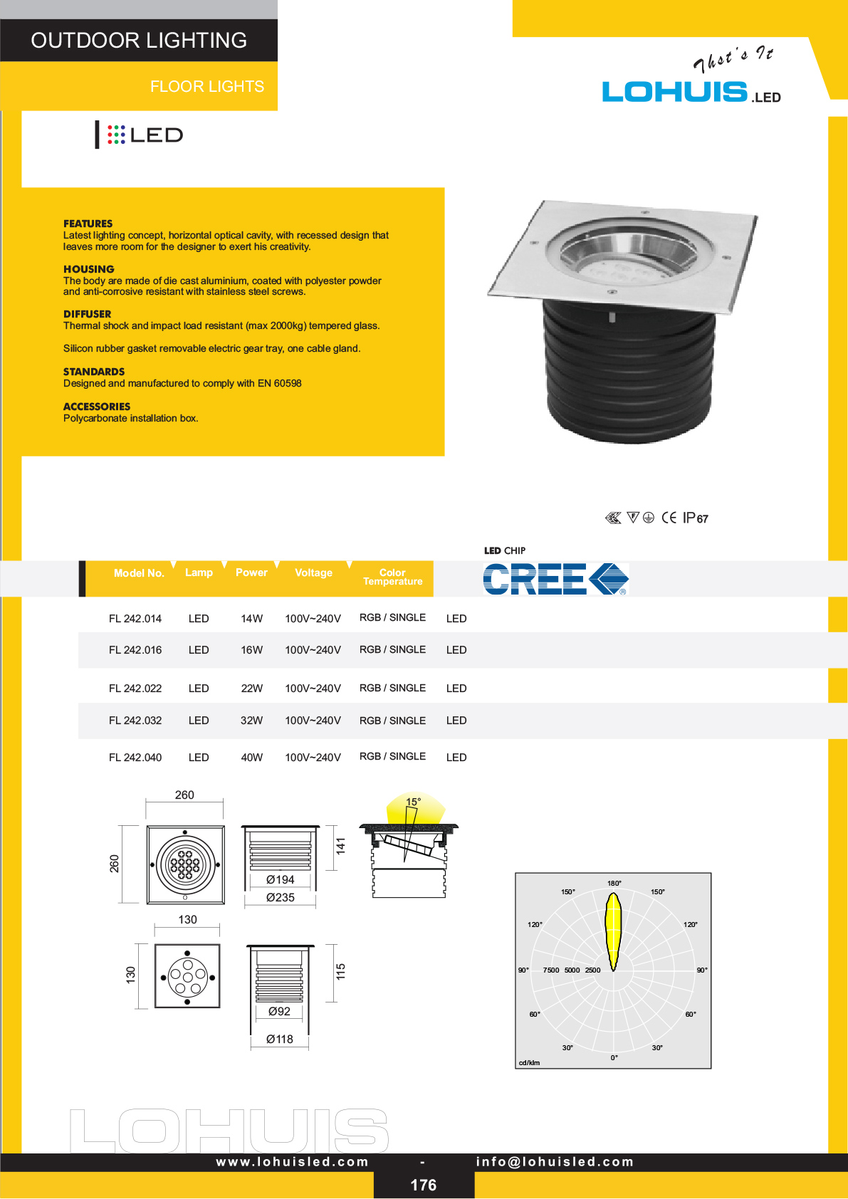 Horizontal optical cavity recessed design; thermal shock & impact-load resistant tempered glass (max 2000 kg); designed & manufactured to comply with EN 60598; accessory: polycarbonate installation box