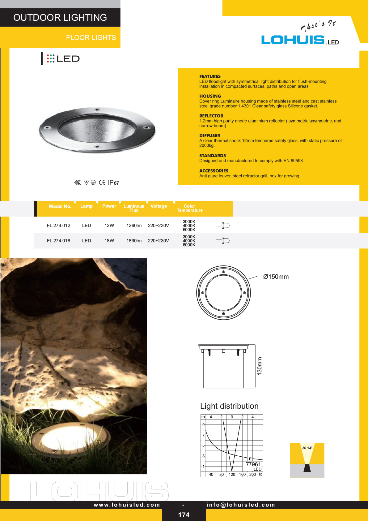 Symmetrical light distribution; reflector options (symmetric/asymmetric/narrow); designed & manufactured to EN 60598; accessories: anti-glare louver, steel refractor grill, installation box