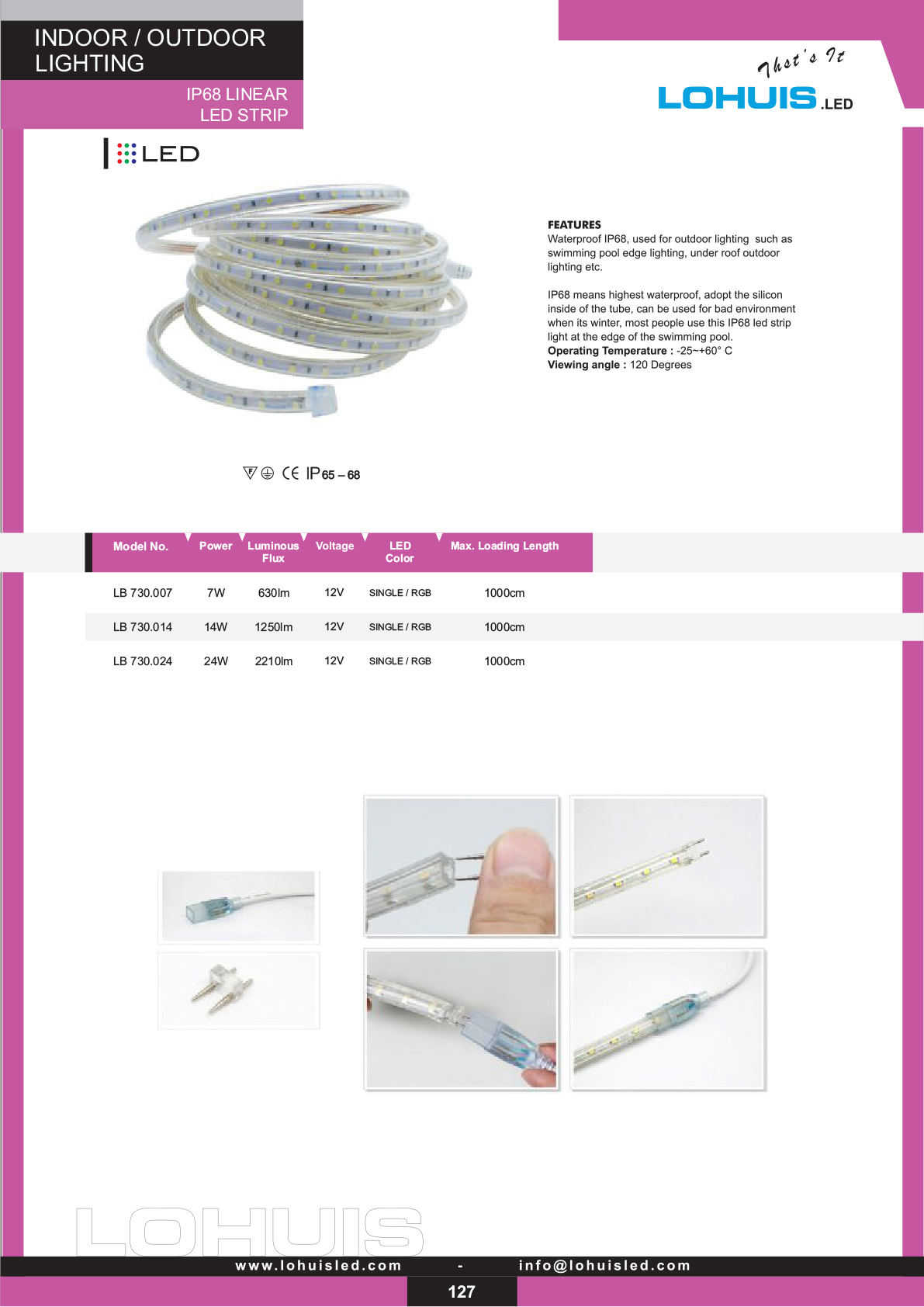 Features: Waterproof IP68; 12 V supply; Single/RGB options; Operating temperature −25°~+60°C; Viewing angle 120°