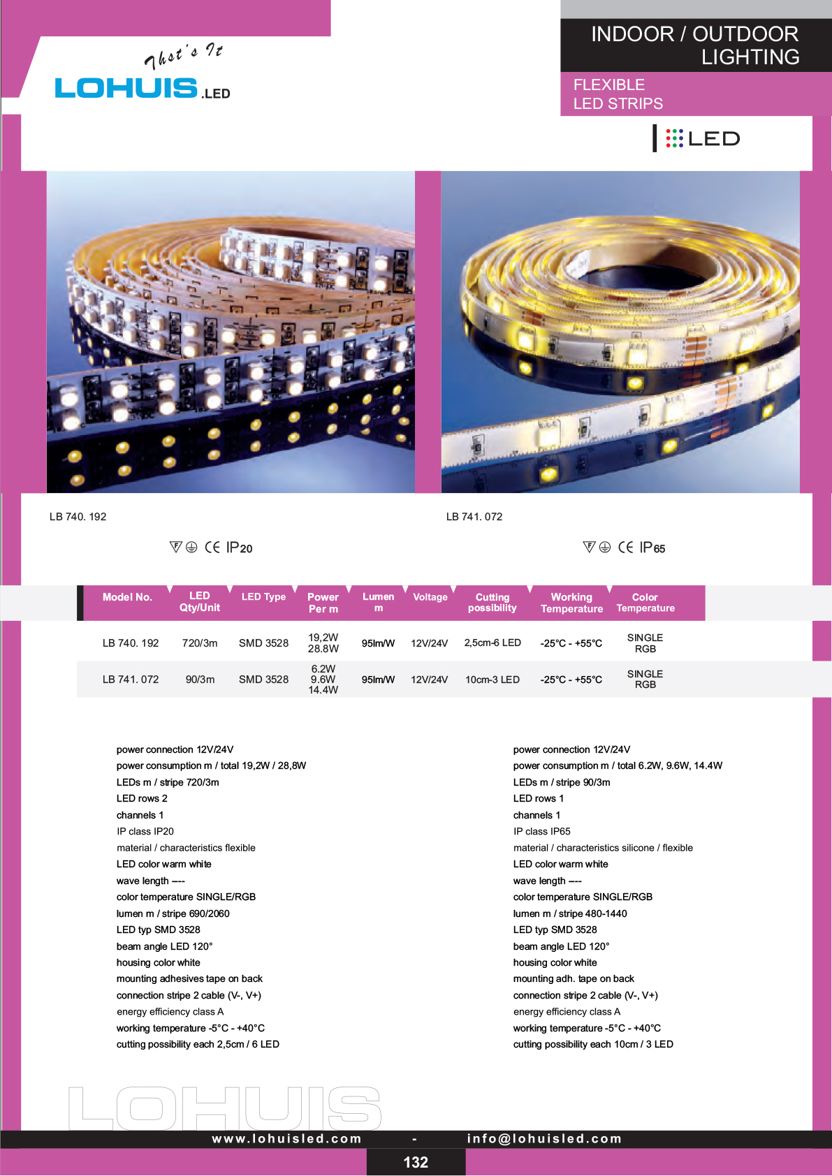 Features: 12/24 V operation; SMD 3528 LEDs; power per meter 19.2 W / 28.8 W (LB 740.192) and 6.2 W / 9.6 W / 14.4 W (LB 741.072); efficacy ~95 lm/W; single/RGB options; beam angle 120°; energy efficiency class A; working temp −5 °C ~ +40 °C; double-sided adhesive mounting