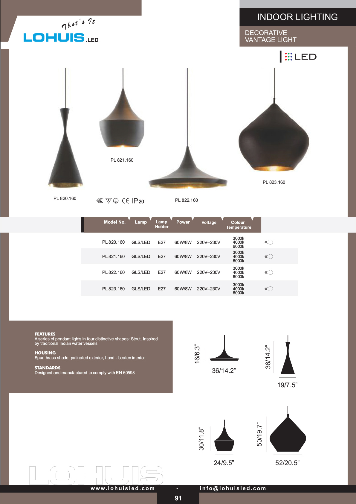Housing: Spun brass shade, Paintted Exterior, Beaten Interior